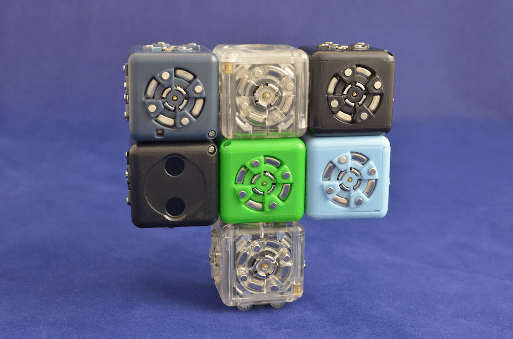 Cubelets are blocks that fit together using magnets. They don’t require programming, and are suitable for the youngest children, though everyone finds them fascinating. Each block has a different function and the blocks you choose and the way they are connected determines how the robot behaves. Each Cubelets kit includes two black sensor blocks (light and distance), two clear action blocks (a drive block with rollers and a light), and a dark grey power block. The bright green block is a connector block that is useful for building larger robots, and the light blue block is a Bluetooth block for communicating with an iPad or Android device.